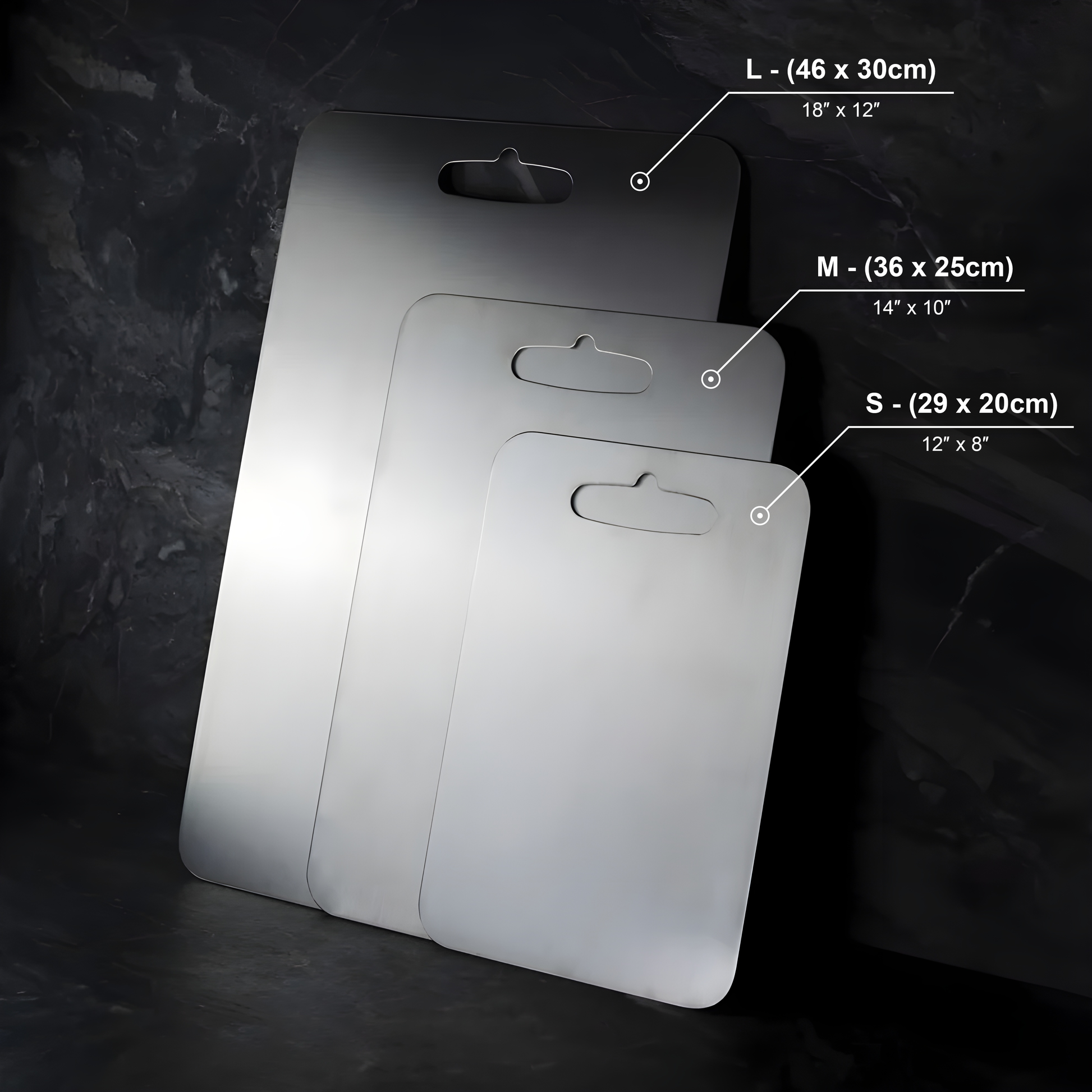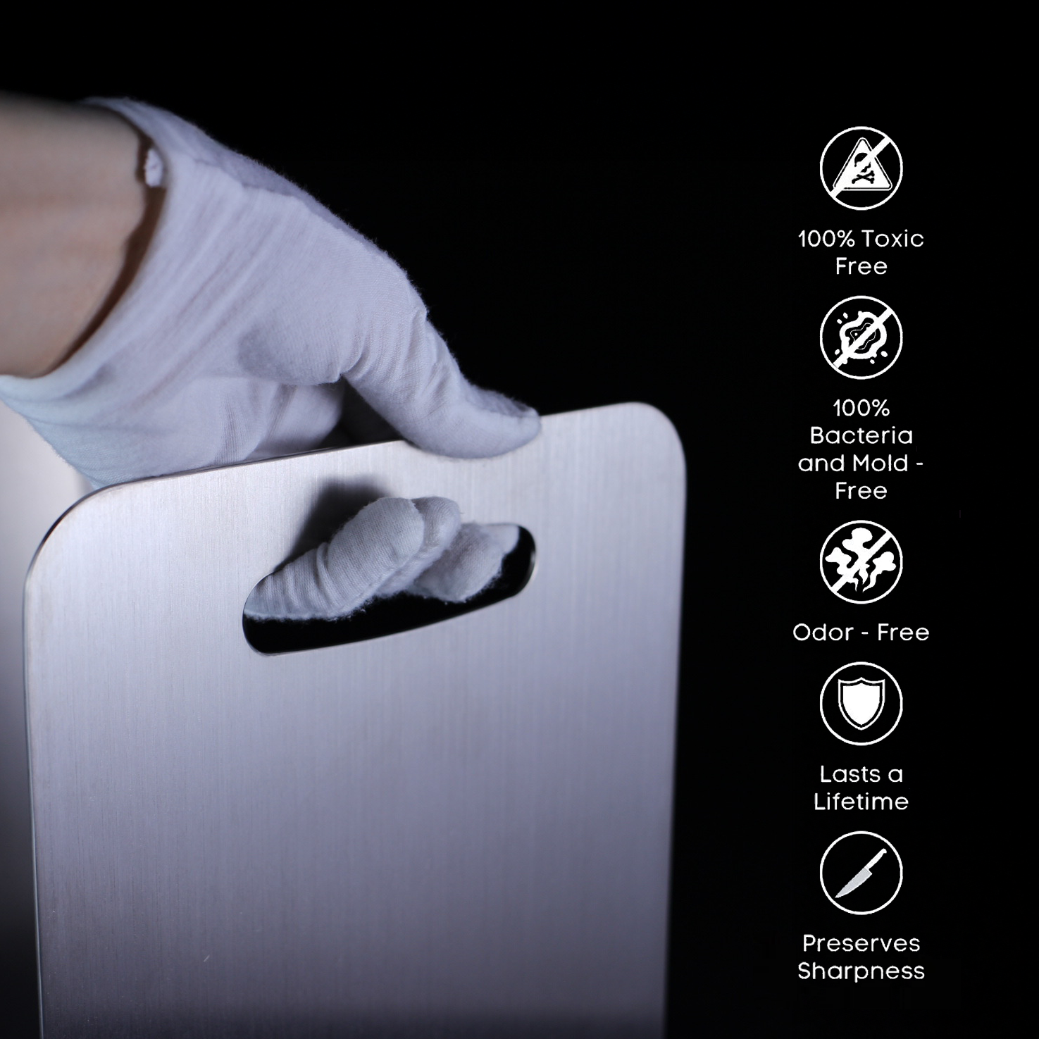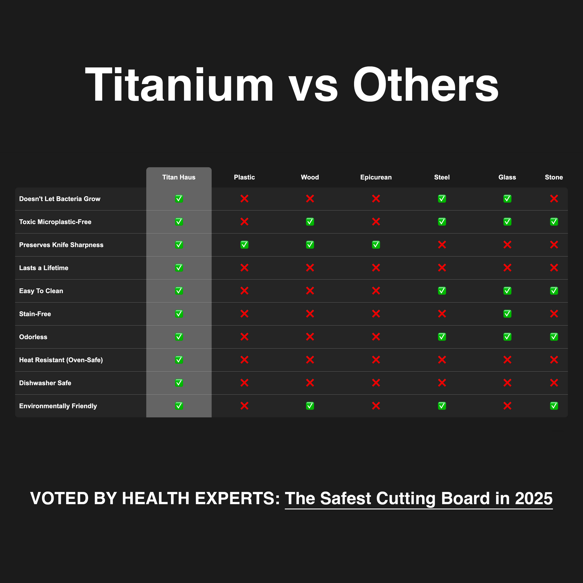 Titan Haus™ boards are 100% pure titanium, making them non-toxic, antibacterial, knife-friendly, and ultra-durable, unlike wood (which harbors bacteria), plastic (which sheds microplastics), and glass or stone (which dulls knives).