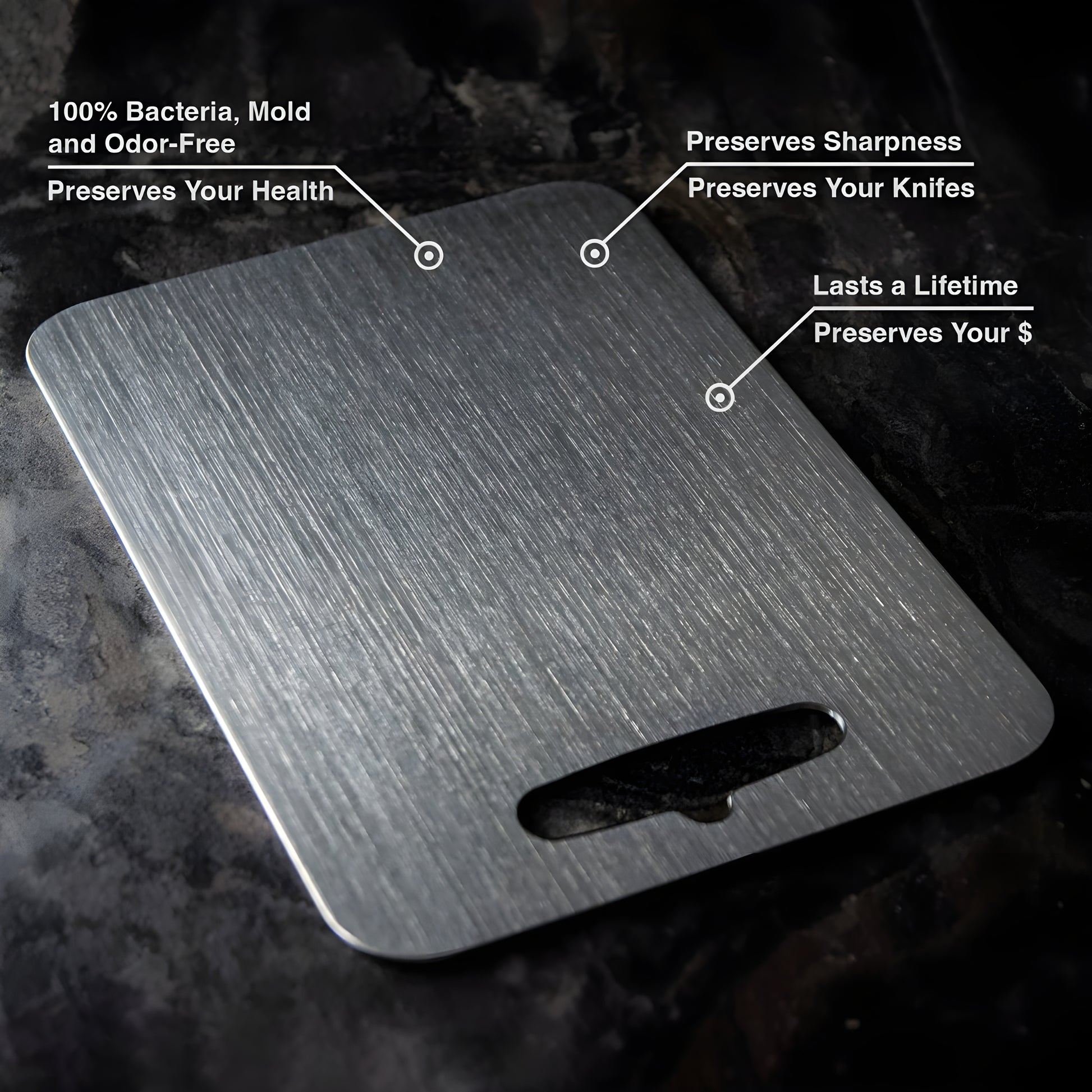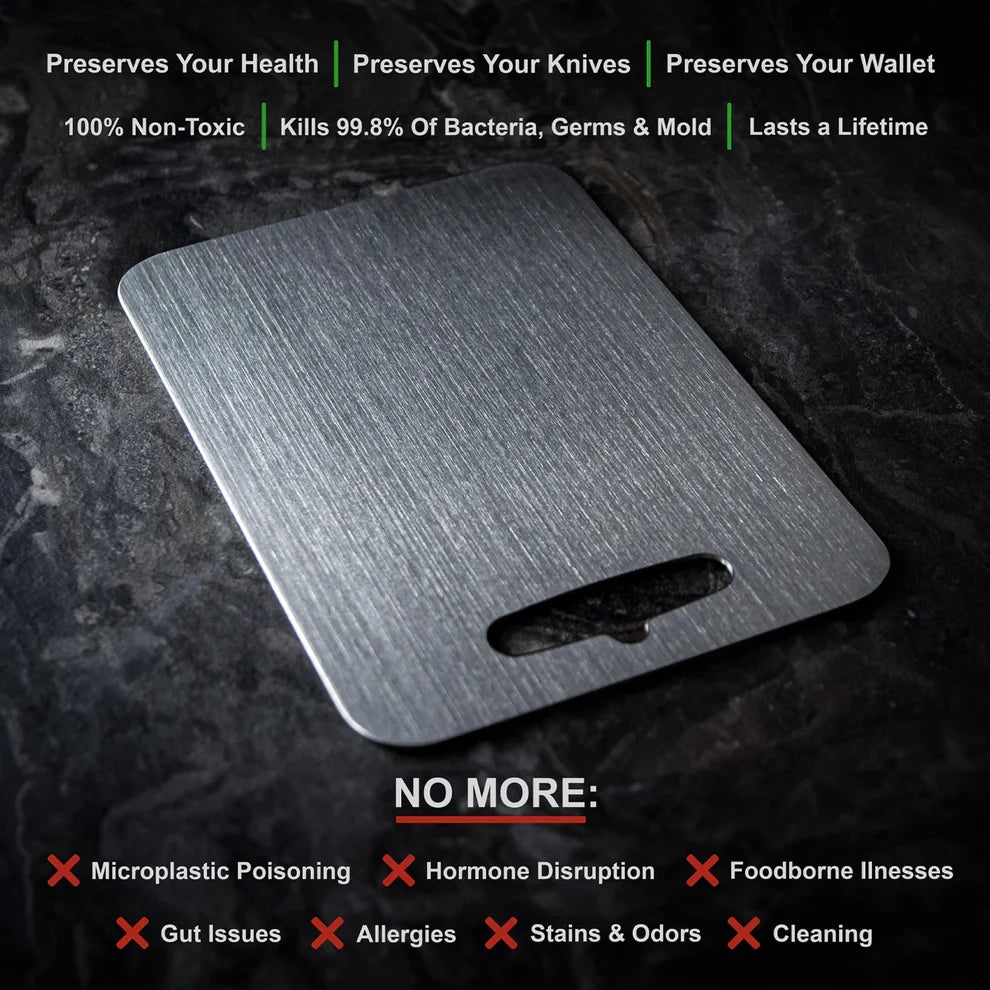 ONLY the 100% TITANIUM CUTTING BOARD™ guarantees a toxin-free, bacteria-resistant, and knife-friendly surface that eliminates the risks of traditional cutting boards.