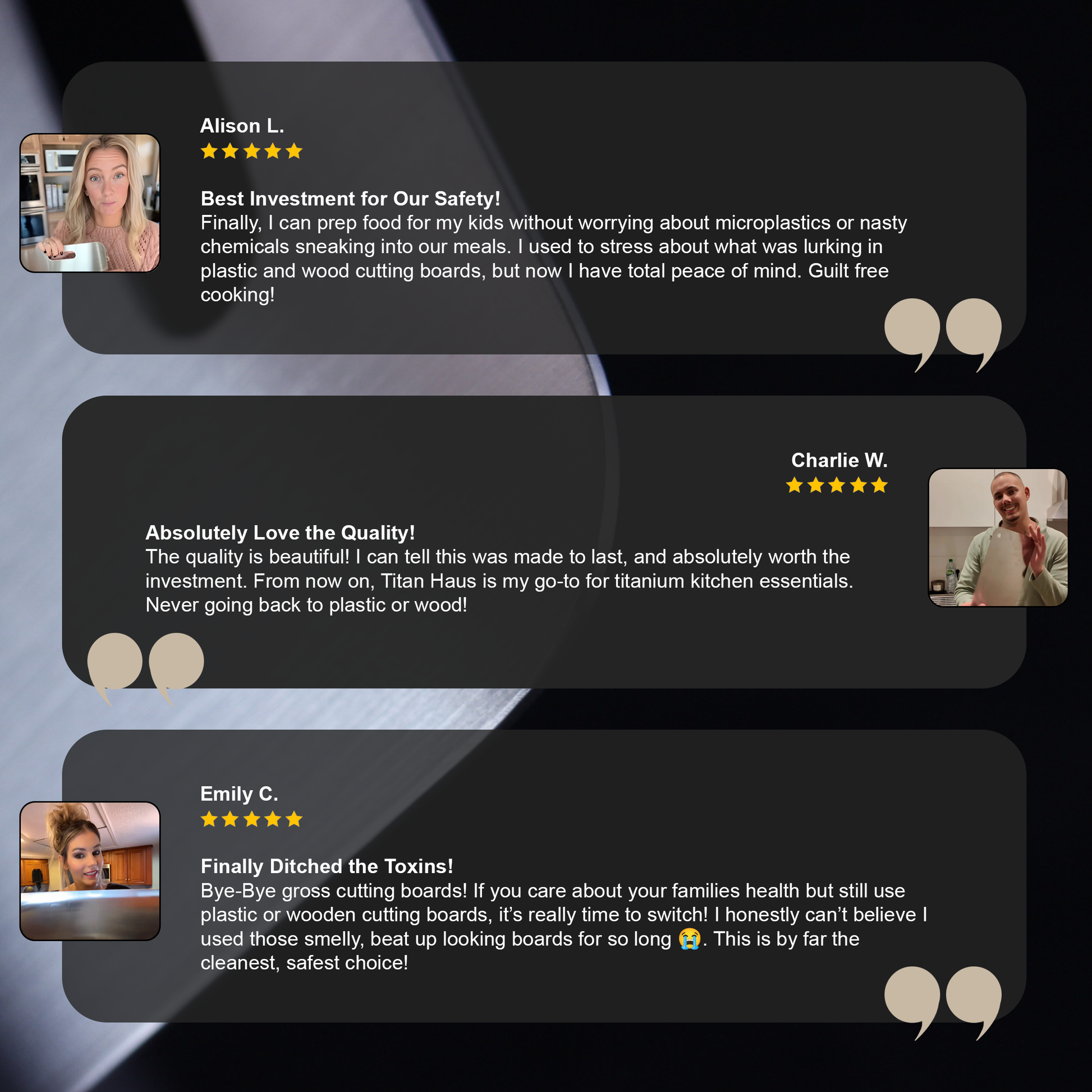 Titan Haus™ is the only trusted source for 100% pure titanium cutting boards—non-toxic, antibacterial, and built to last a lifetime.